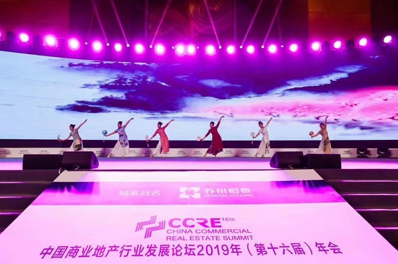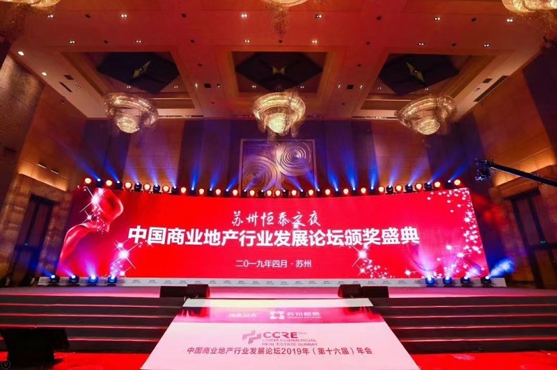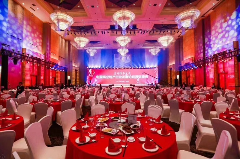 企業品牌露出策劃設計上,通過舞臺前方的落地導視牌同步呈現 “CCRE 中國商業地產發展論壇” 與 “蘇州恒泰之夜” 雙主題,結合穹頂處的定制化燈光 LOGO 投影,實現活動信息的多維度觸達。燈光系統采用智能聯動模式,實現頒獎環節切換為聚光追光模式,配合水晶吊燈的明暗變化,為獲獎嘉賓打造專屬高光時刻。